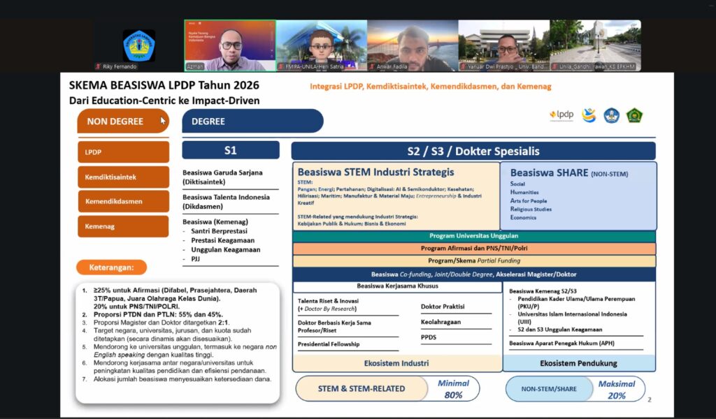 (Unila): Universitas Lampung (Unila) membuka peluang lebih luas bagi sivitas akademika untuk mengakses beasiswa dan jejaring pendidikan global melalui Sosialisasi Program Beasiswa Lembaga Pengelola Dana Pendidikan (LPDP) 2026 secara daring, Kamis 23 April 2026.