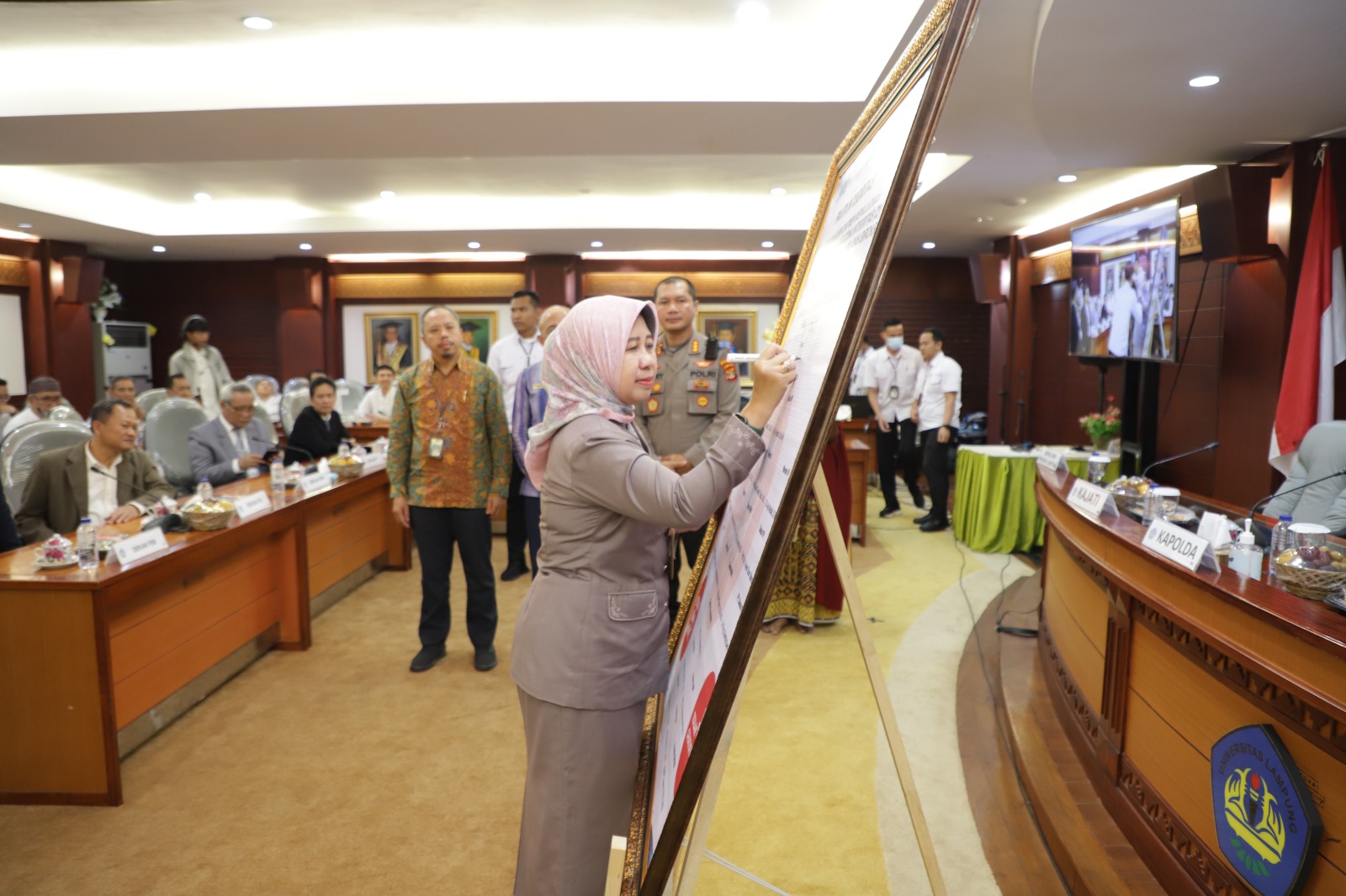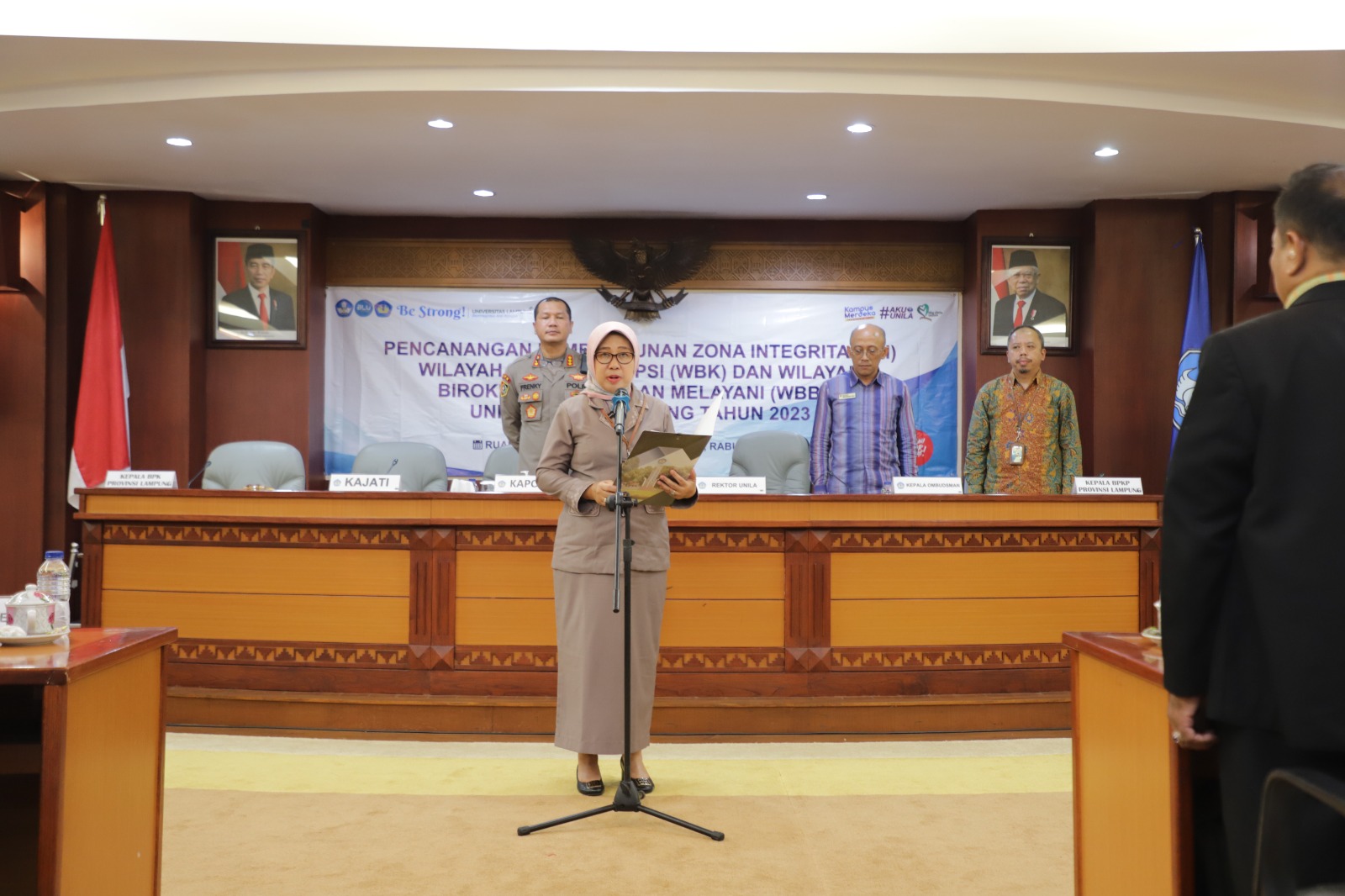 (Unila): Universitas Lampung (Unila) mendeklarasikan pencanangan Zona Integritas (ZI) Menuju Wilayah Bebas dari Korupsi (WBK), Wilayah Birokrasi Bersih dan Melayani (WBBM) bersama seluruh jajaran pimpinan Unila, di ruang sidang utama lantai dua, Rabu, 12 Juli 2023.