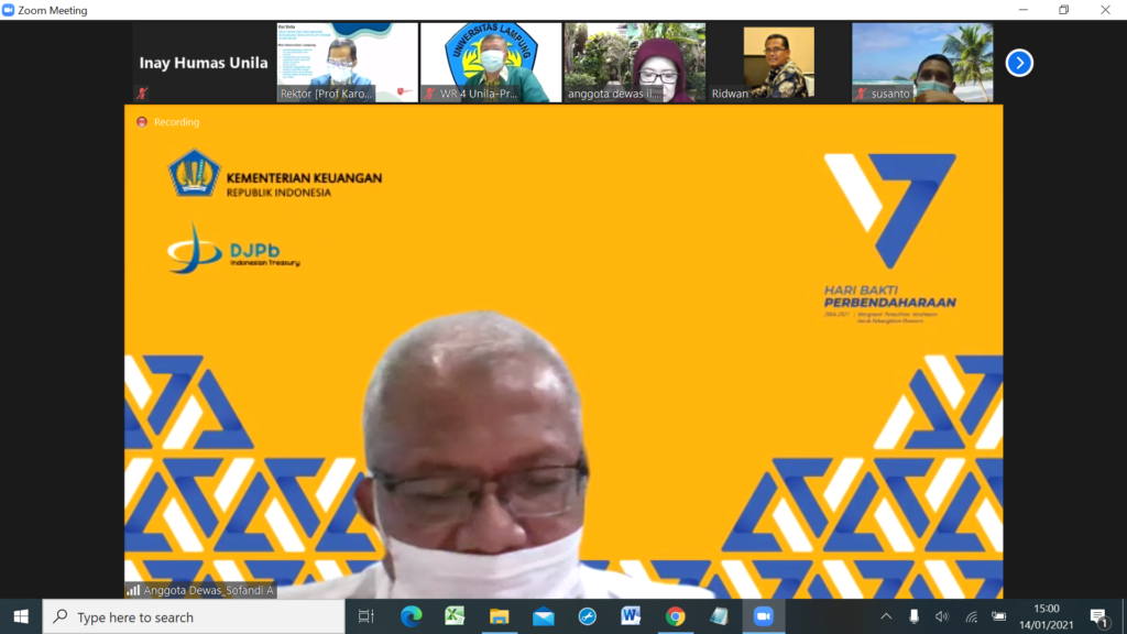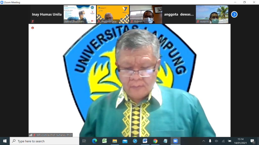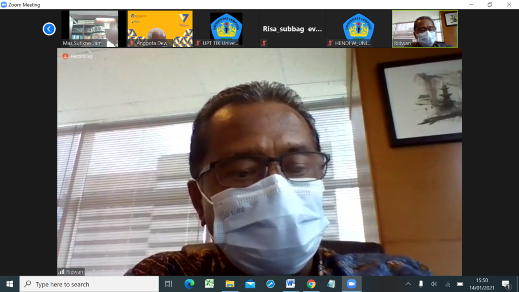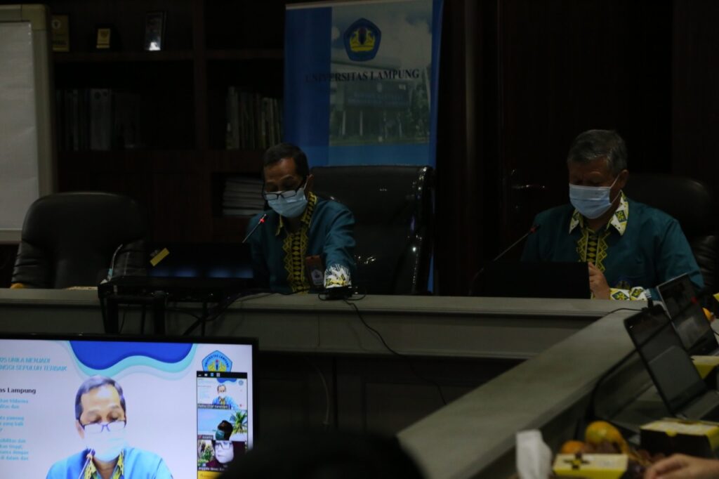 Hadir secara virtual mewakili Dewan Pengawas BLU Unila Dr. Ir. Ridwan, M.Sc., Dr. Illah Sailah, M.S., dan Sofandi Arifin.