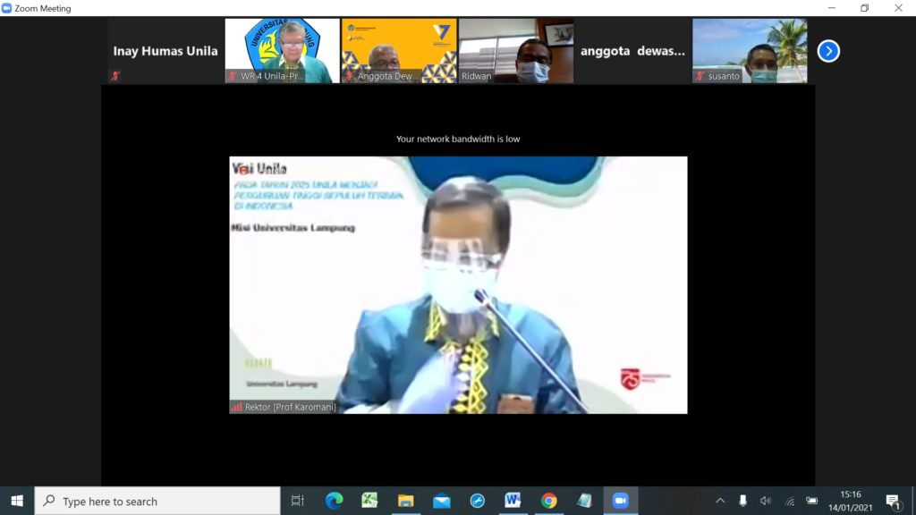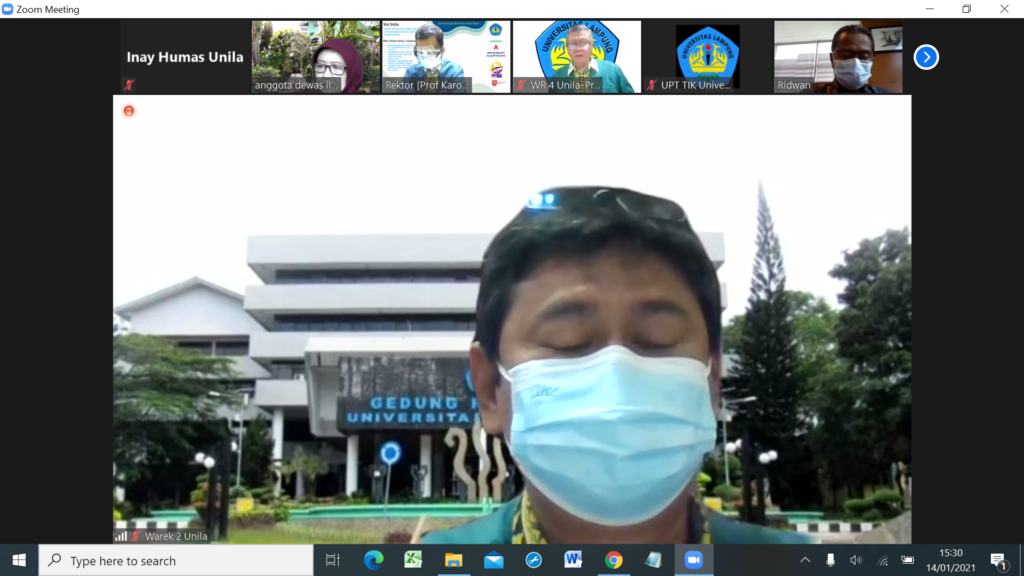 (Unila): Universitas Lampung (Unila) menggelar rapat koordinasi dengan Dewan Pengawas BLU Unila, Kamis, 14 Januari 2021. Rapat dibuka langsung Rektor Unila Prof. Dr. Karomani, M.Si., di ruang sidang senat, Gedung Rektorat, lantai 2.