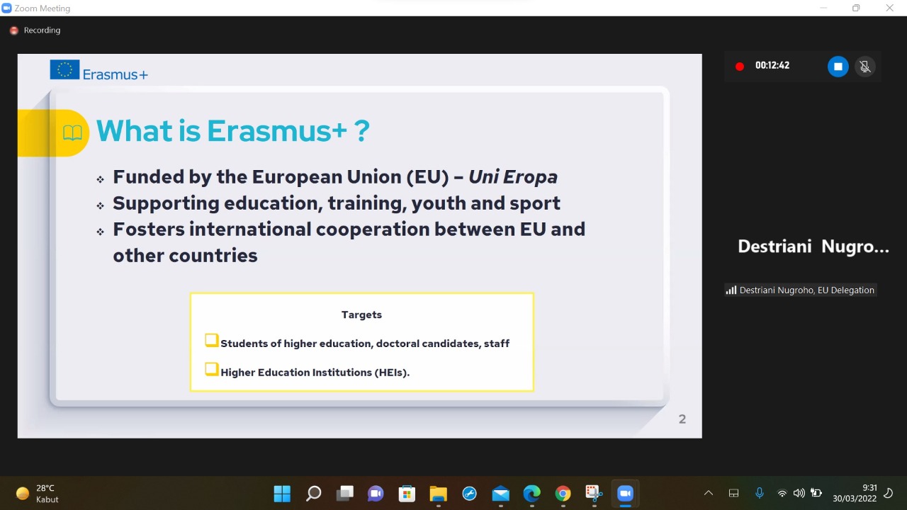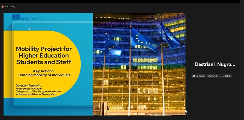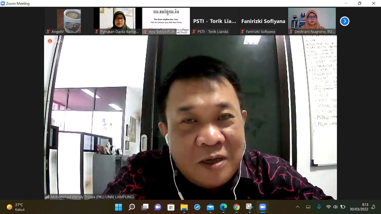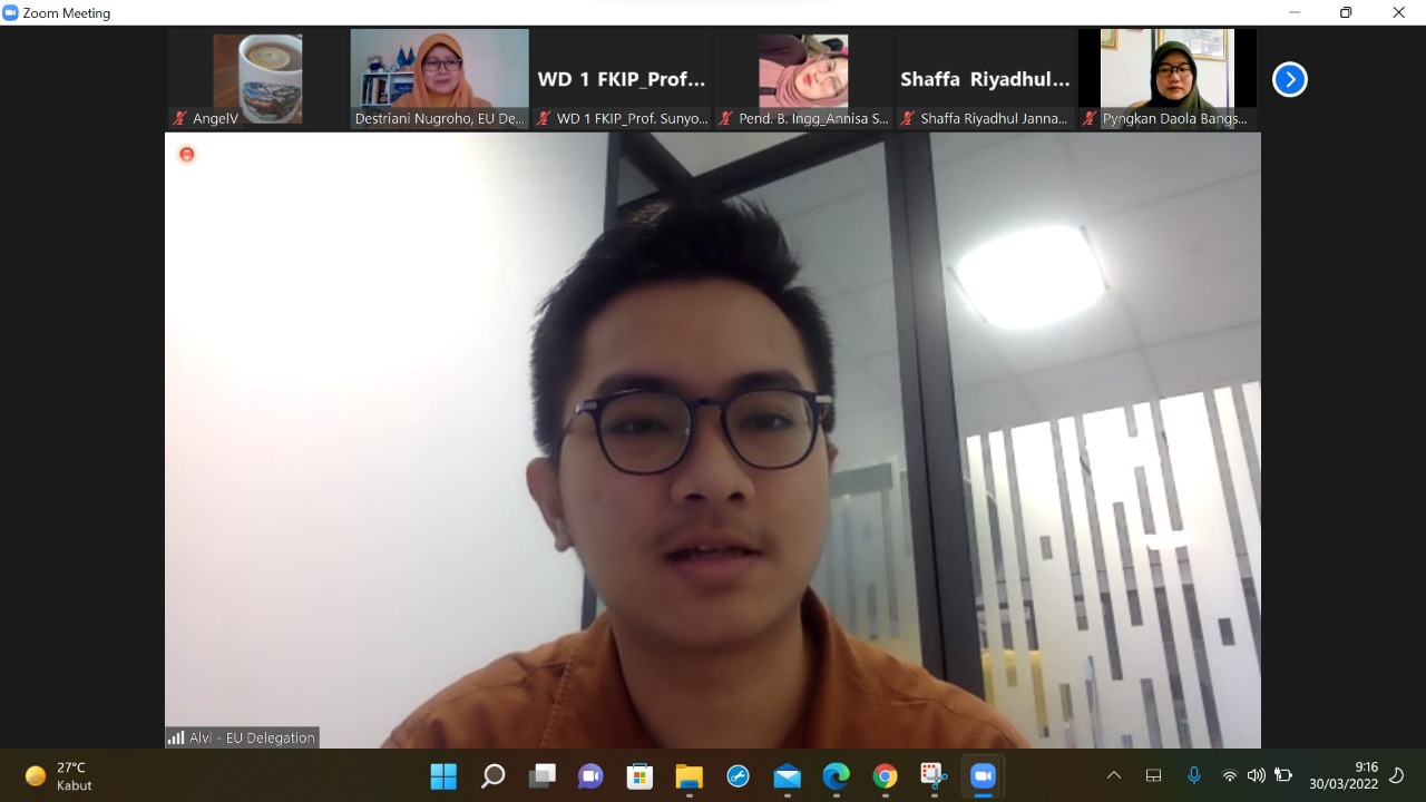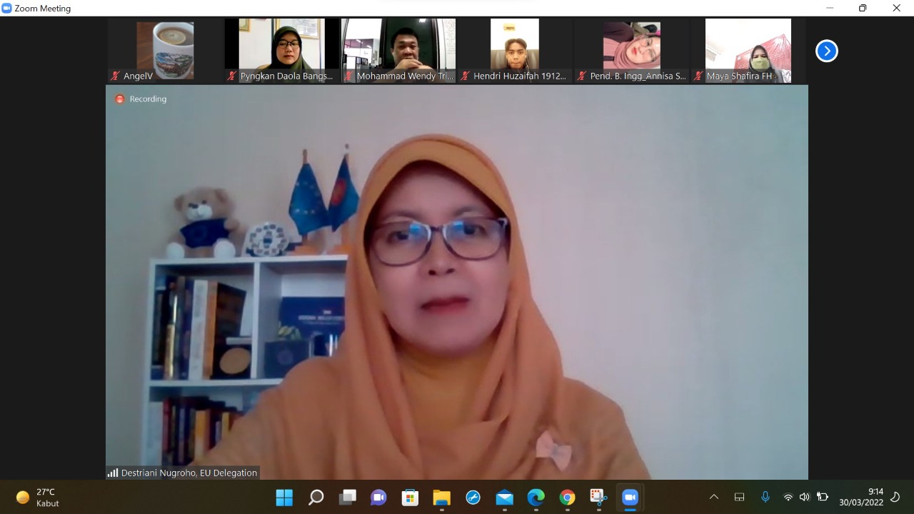 (Unila): Universitas Lampung (Unila) dan EU Embassy melakukan pertemuan virtual via Zoom pada Rabu, 30 Maret 2022. Pertemuan tersebut dihadiri tim UPT PKLI, Delegasi Uni Eropa untuk Indonesia dan Brunei Darussalam Destriani Nugroho, para wakil dekan, serta mahasiswa di lingkungan kampus setempat. []