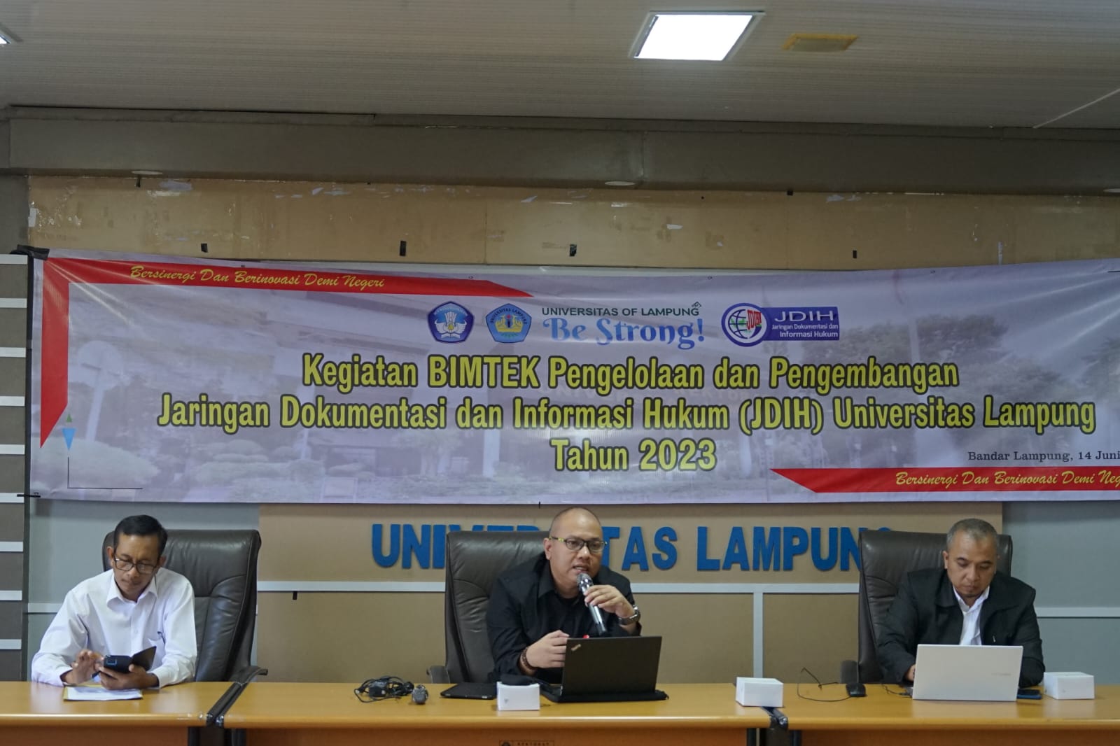 (Unila): Universitas Lampung (Unila) menyelenggarakan kegiatan bimbingan teknis (bimtek) Pengelolaan dan Pengembangan Jaringan Dokumentasi dan Informasi Hukum (JDIH) pada Rabu, 14 Juni 2023. Kegiatan diikuti 50 peserta perwakilan fakultas, unit, dan UPT di lingkungan Unila.