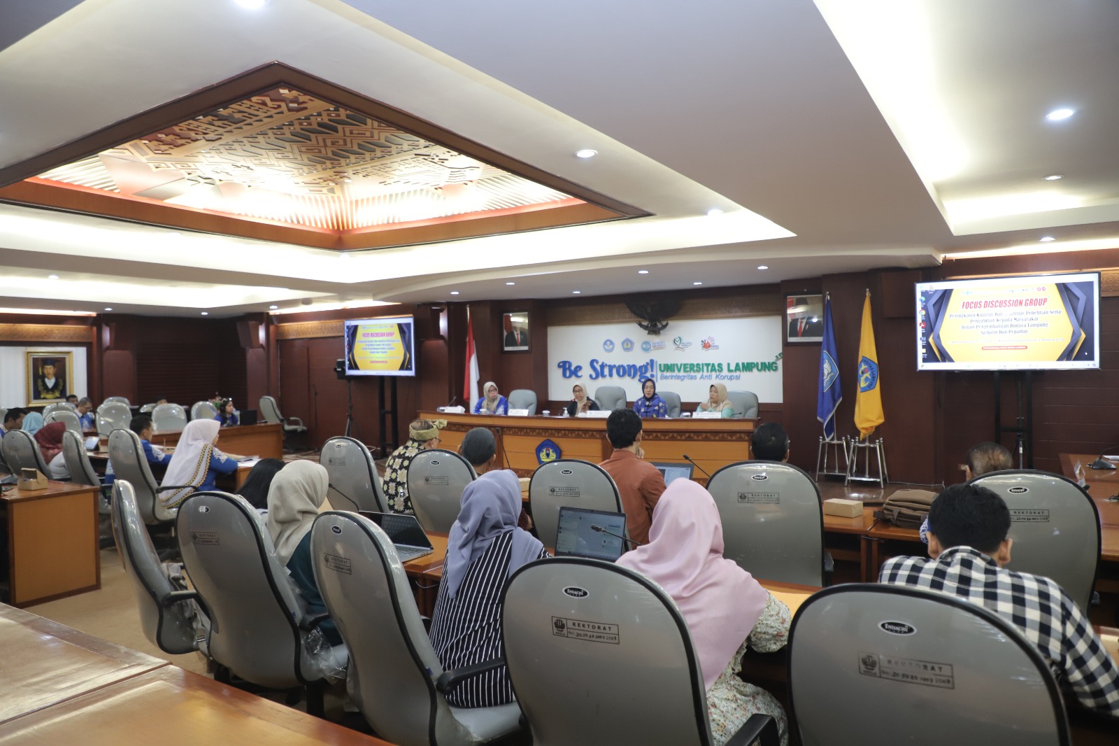 FGD tersebut dibuka Rektor Unila, Prof. Dr. Lusmelia Afriani, D.E.A. IPM., ASEAN Eng., dan dihadiri Ketua dan Sekretaris Lembaga Penelitian dan Pengabdian kepada Masyarakat (LPPM) Unila, Wakil Rektor Bidang Kemahasiswaan dan Alumni Dr. Anna Gustina Zainal, M.Si., para Budayawan Lampung, Ketua Prodi S-1 dan S-2 Pendidikan Bahasa Lampung, Ketua Dewan Kesenian Lampung, Kepala UPTD Taman Budaya Provinsi Lampung, serta Ketua dan Sekretaris Pusat Penelitian Budaya Lampung LPPM Unila.
