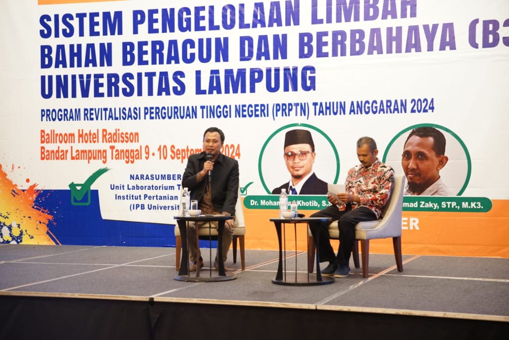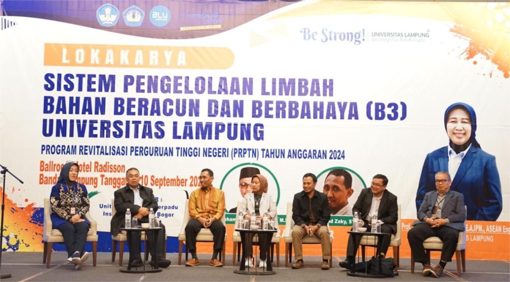 (Unila): Universitas Lampung (Unila) menggelar Lokakarya Sistem Pengelolaan Limbah Bahan Beracun dan Berbahaya (B3) yang merupakan bagian dari Program Revitalisasi Perguruan Tinggi Negeri (PRPTN) tahun anggaran 2024. Kegiatan berlangsung di Ballroom Hotel Radisson, Bandar Lampung, pada 9-10 September 2024.