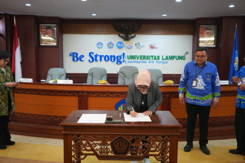 Acara ditutup dengan penandatanganan pakta integritas oleh para pimpinan Unila sebagai bentuk komitmen nyata Unila dalam mendukung upaya pencegahan dan penanganan kekerasan di lingkungan kampus. [Magang_Dimas Permadi]