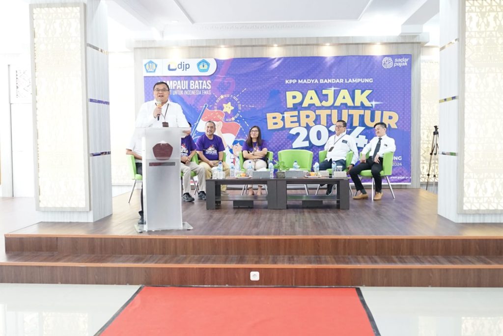 (Unila): Universitas Lampung (Unila) menggelar sosialisasi Pajak Bertutur 2024, di Ruang Student Business Center Fakultas Ekonomi dan Bisnis kampus setempat, Rabu, 7 Agustus 2024. Acara dibuka Wakil Rektor Bidang Akademik Dr. Eng. Suripto Dwi Yuwono, S.Si., M.T.