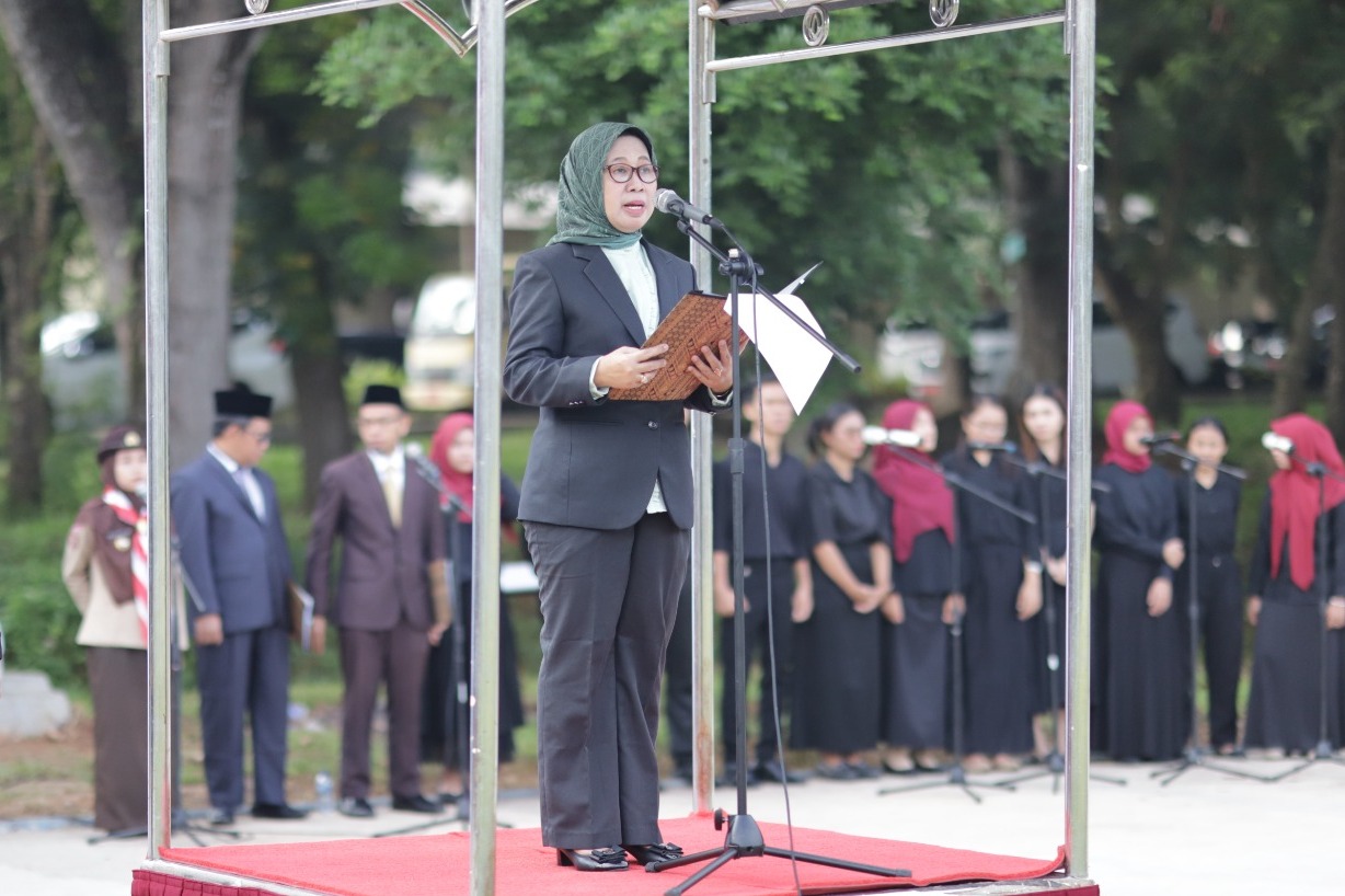 Rektor Unila Prof. Dr. Ir. Lusmeilia Afriani, D.E.A., I.P.M., yang bertugas sebagai pembina upacara membacakan sambutan Plt. Menteri Komunikasi dan Informatika RI Mahfud MD.