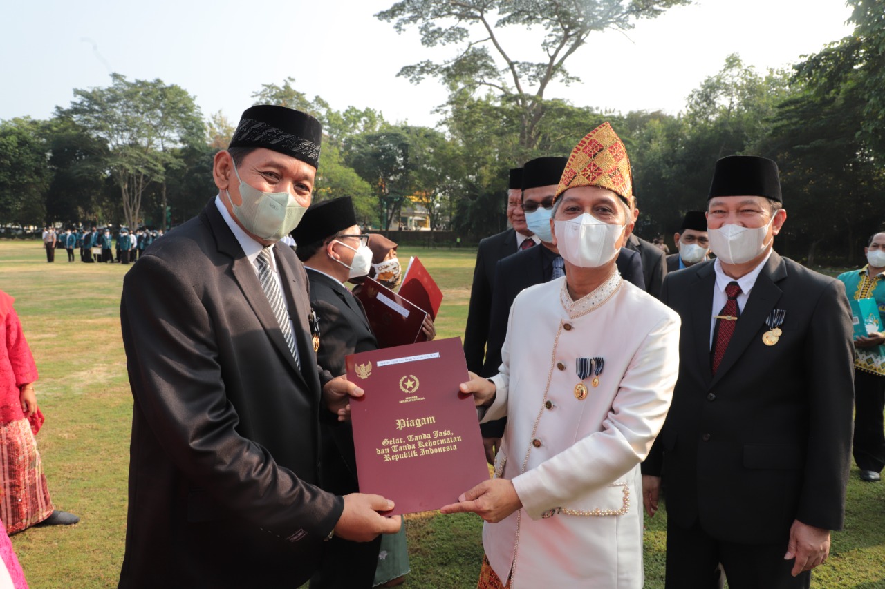 Pada upacara tahunan tersebut rektor Unila juga menyerahkan penghargaan Satya Lencana 30, 20, dan 10 tahun kepada PNS di lingkungan Unila serta penyerahan sembilan SK Guru Besar. [Humas/Angel]