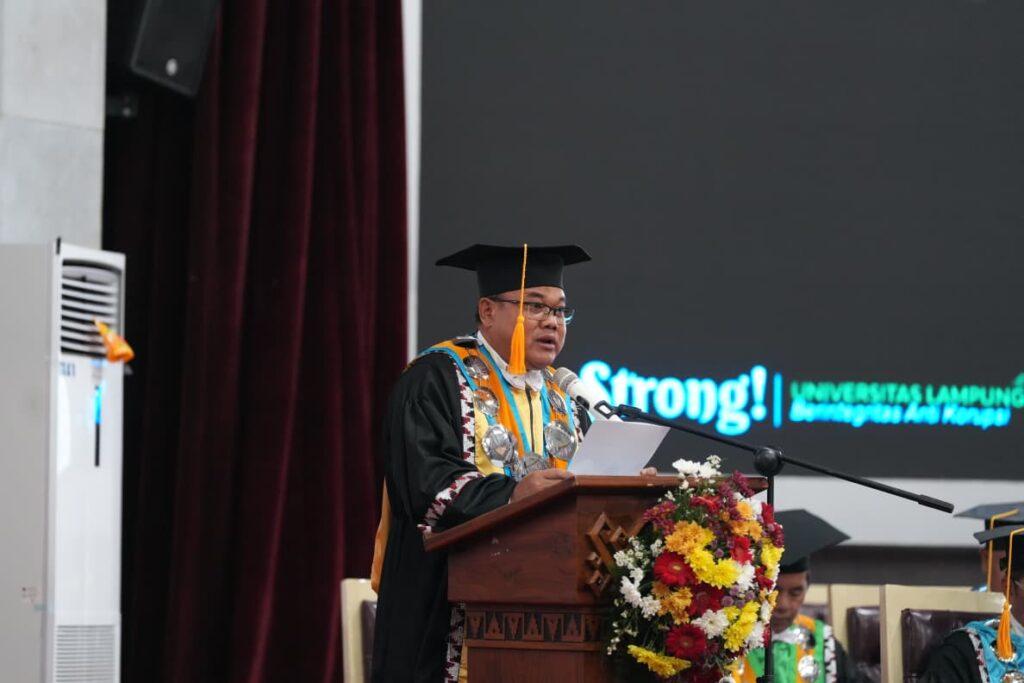 Rektor Unila, Prof. Dr. Ir. Lusmeilia Afriani, D.E.A., IPM., ASEAN Eng., menyampaikan ucapan selamat kepada para lulusan dan ucapan terima kasih serta penghargaan yang tinggi kepada seluruh tenaga pendidik dan tenaga kependidikan atas kerja keras dan kerja sama dalam melaksanakan tugas mendidik mahasiswa.