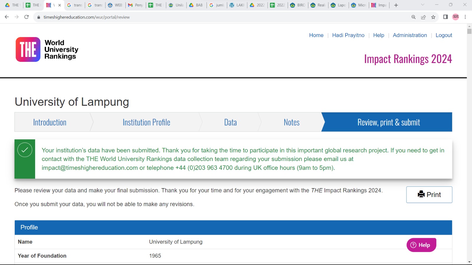 (Unila): Universitas Lampung (Unila) secara resmi men-submit kembali data pemeringkatan untuk penilaian Times Higher Education Impact Rankings 2024. Submit data dilakukan langsung Rektor Unila Prof. Ir. Lusmeilia Afriani, D.E.A., IPM., ASEAN Eng., didampingi wakil rektor 1, 3, dan 4 Unila di ruang sidang senat lantai dua Rektorat, Jumat, 10 November 2023.