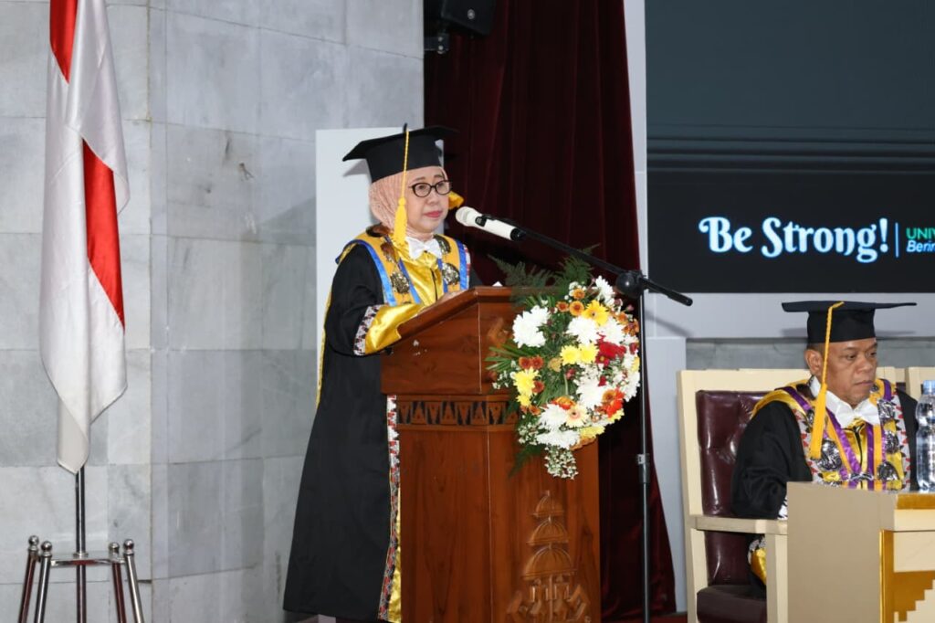Rektor Unila Prof. Lusmeilia Afriani dalam sambutannya berharap agar para guru besar yang baru dikukuhkan dapat terus memberikan kontribusi nyata bagi universitas dan masyarakat.