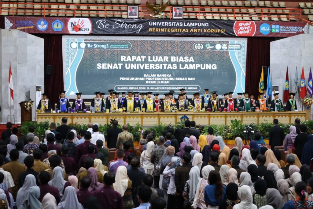 (Unila): Universitas Lampung (Unila) menggelar rapat senat luar biasa dalam rangka pengukuhan guru besar dan penyampaian orasi ilmiah, pada Senin, 26 Januari 2026, di Gedung Serbaguna (GSG) Unila.
