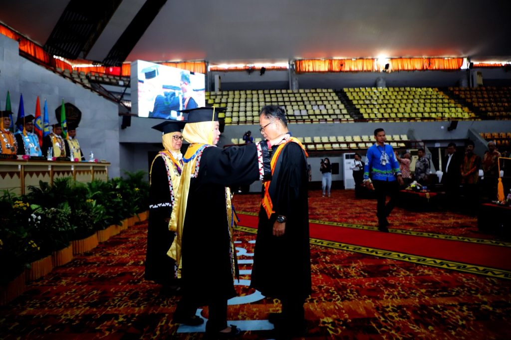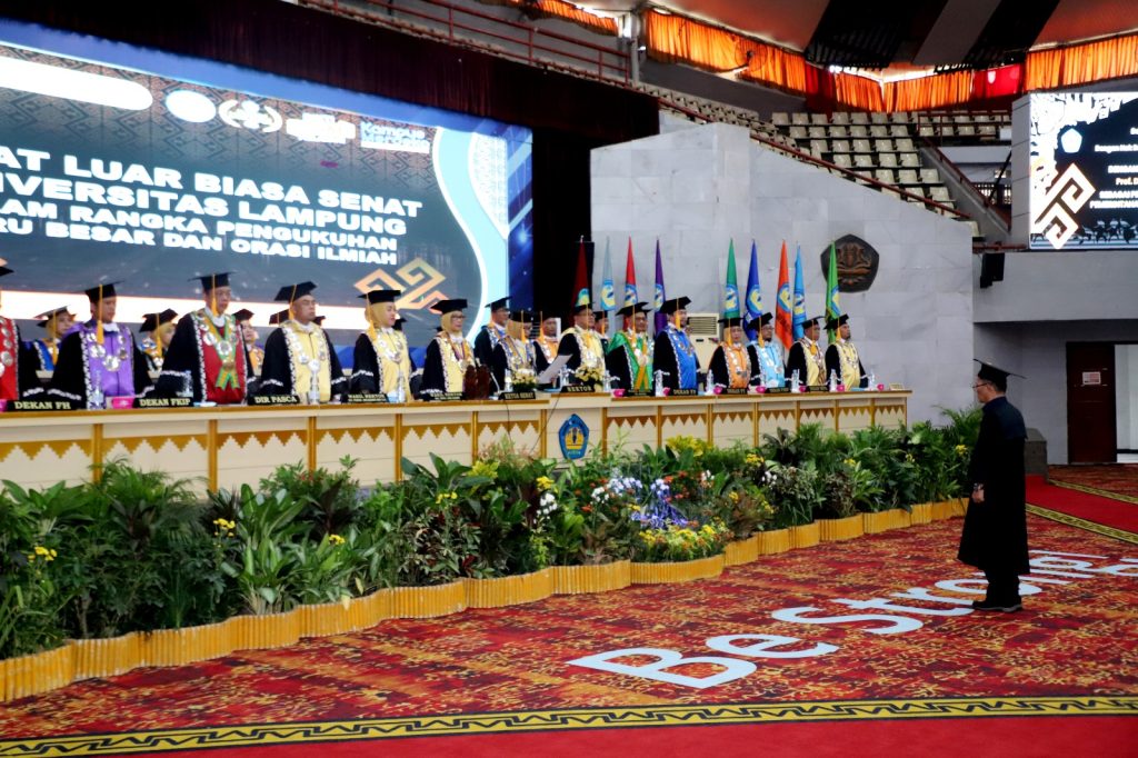 Pengukuhan dilakukan Rektor Unila Prof. Dr. Ir. Lusmeilia Afriani, D.E.A., IPM., ASEAN Eng., di hadapan para wakil rektor, senat akademik, guru besar, dekan, wakil dekan, dosen, mahasiswa, serta segenap sivitas akademika Unila.