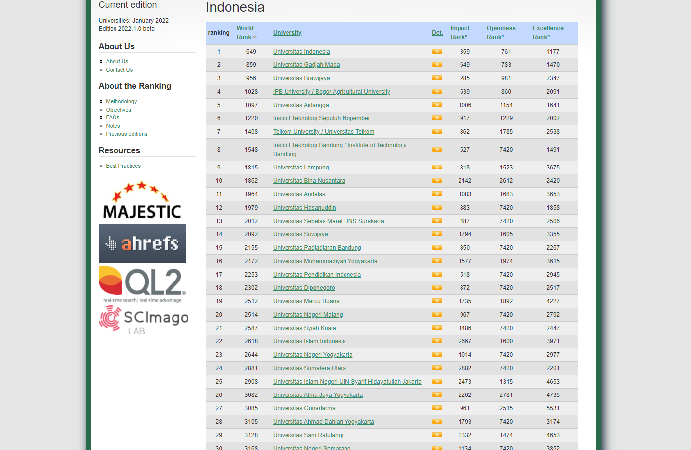 Berikut daftar perguruan tinggi yang masuk 15 besar terbaik Indonesia versi webometrics: