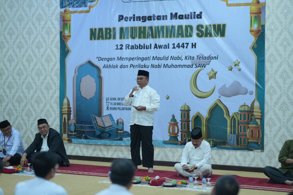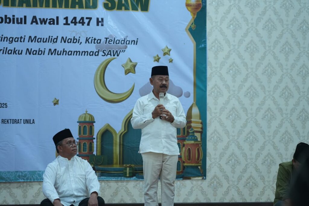 (Unila): Keluarga Besar Universitas Lampung (Unila) menggelar peringatan Maulid Nabi Muhammad saw., 12 Rabiul Awal 1447 H/2025 M, pada Senin, 8 September 2025, di Ruang Pelantikan lantai empat Gedung Rektorat Unila.