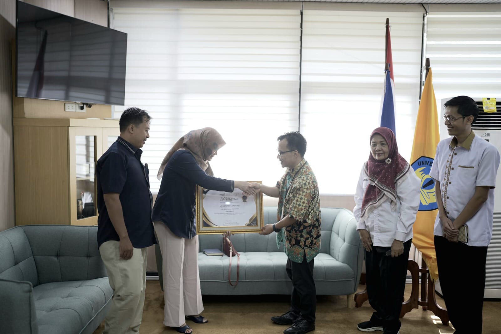 Serah terima penghargaan juga disaksikan Kepala Biro Umum dan Keuangan Ida Ropaida, S.E., M.M., Koordinator Bagian Keuangan Unila Hendi Wibowo, S.E., AAP.A., dan Subkoordinator pada Subbagian Akuntansi dan Pelaporan Bagian Keuangan BUK Nurwahid, S.E., AAP.A.