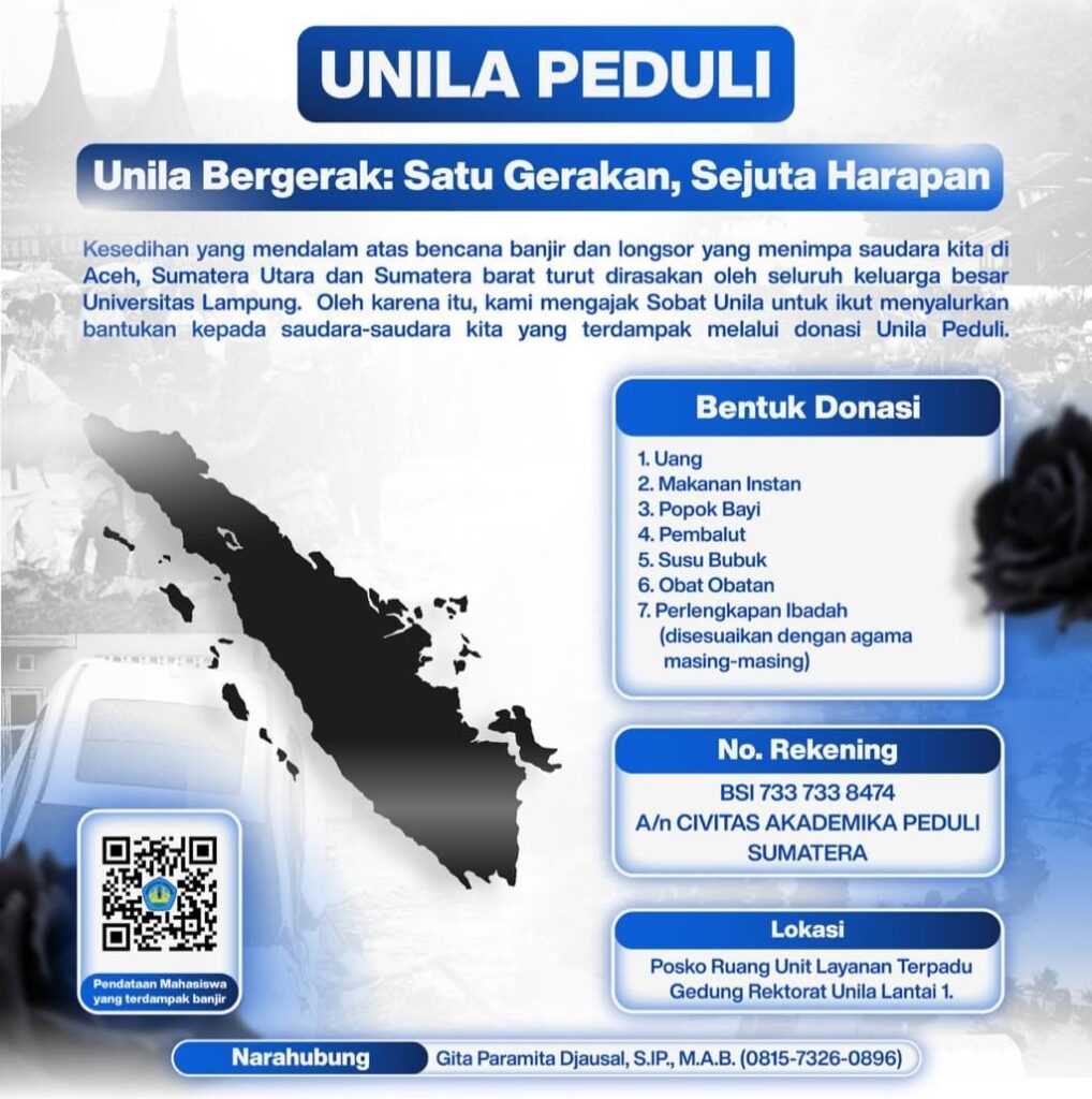 Selain bantuan tunai dan tenaga medis, Unila membuka donasi barang berupa makanan instan, pakaian, perlengkapan ibadah, dan kebutuhan pokok lainnya.