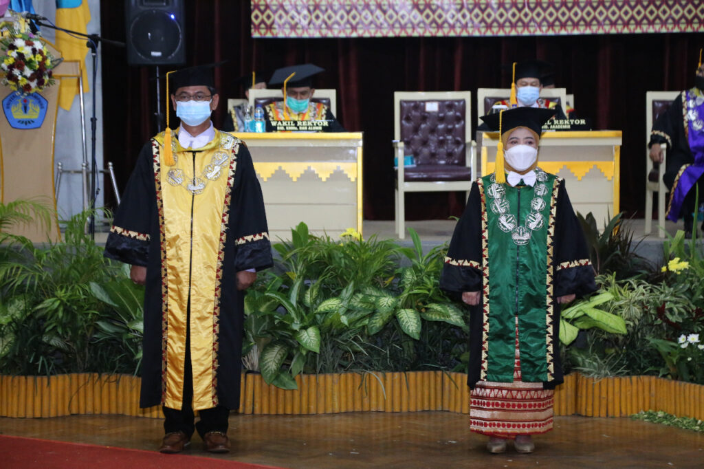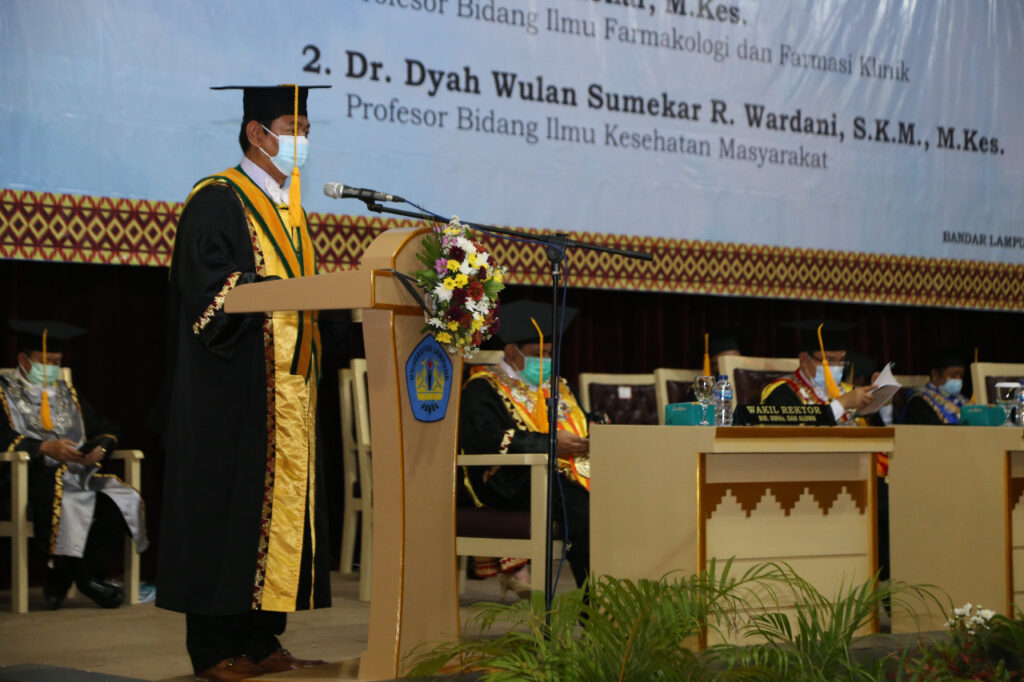 Pengukuhan berlangsung offline di Gedung Serbaguna Unila dan juga secara live via Zoom, Rabu, 24 Februari 2021.