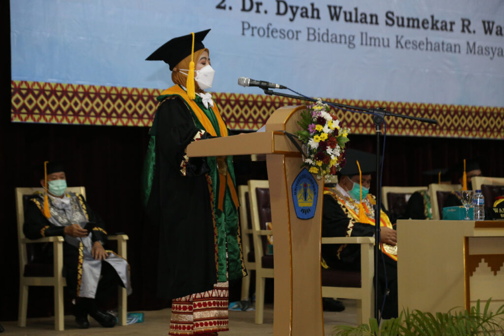 Selanjutnya Prof. Dr. Dyah Wulan Sumekar R. Wardani, S.K.M., M.Kes., menyampaikan orasi berjudul “Pendekatan Determinan Sosial dalam Pembangunan Kesehatan Masyarakat: Konsep dan Implementasinya pada Penanggulangan Tuberkulosis”.