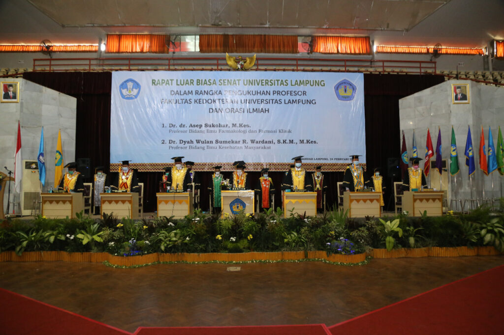 (Unila): Rektor Universitas Lampung (Unila) Prof. Dr. Karomani, M.Si., mengukuhkan dua Guru Besar Fakultas Kedokteran (FK) yakni Dr. dr. Asep Sukohar, S.Ked., M.Kes., dan Dr. Dyah Wulan Sumekar R. Wardani, S.K.M., M.Kes.