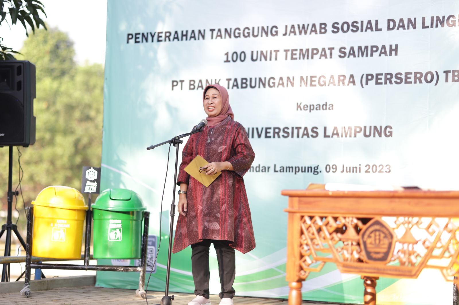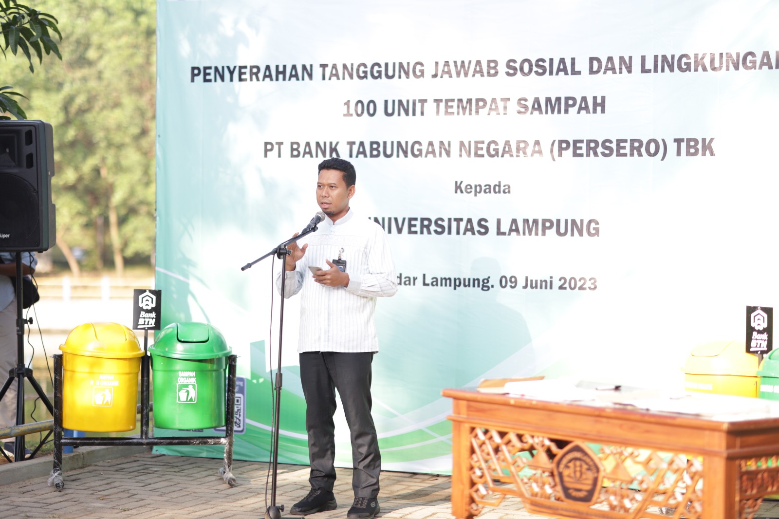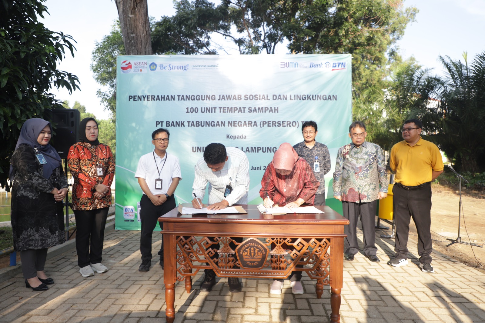 (Unila): Universitas Lampung (Unila) menerima hibah 100 tempat sampah dari PT Bank Tabungan Negara (Persero). Hibah tersebut diserahkan pada acara Coffee Morning dan Penandatanganan Serah Terima Hibah dari Bank BTN yang berlangsung di Embung Rusunawa Unila, Jumat pagi, 9 Juni 2023.