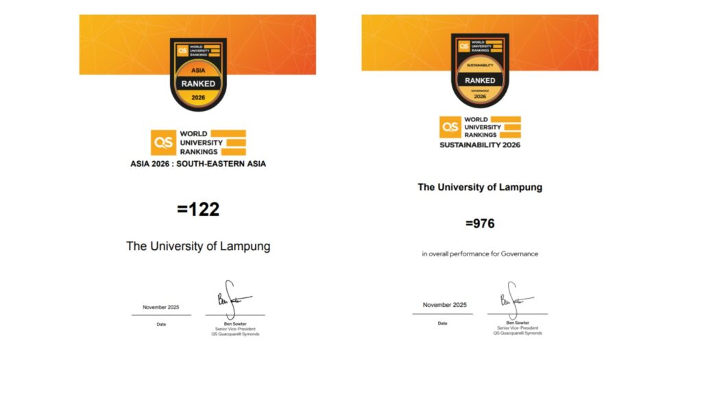 (Unila): Universitas Lampung (Unila) kembali mencatatkan capaian dalam pemeringkatan internasional QS World University Rankings dan QS Asia University Rankings tahun 2026.