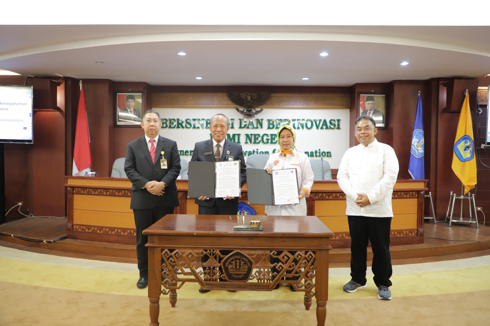 Penandatanganan Nota Kesepahaman dan Perjanjian Kerja Sama dilakukan Rektor Unila Prof. Dr. Ir. Lusmeilia Afriani, D.E.A., I.P.M., dan Rektor UPGRIP Dr. Bukman Lian, M.M., M.Si., CIQaR, di ruang sidang utama lantai dua Rektorat Unila pada Rabu, 3 Mei 2023.