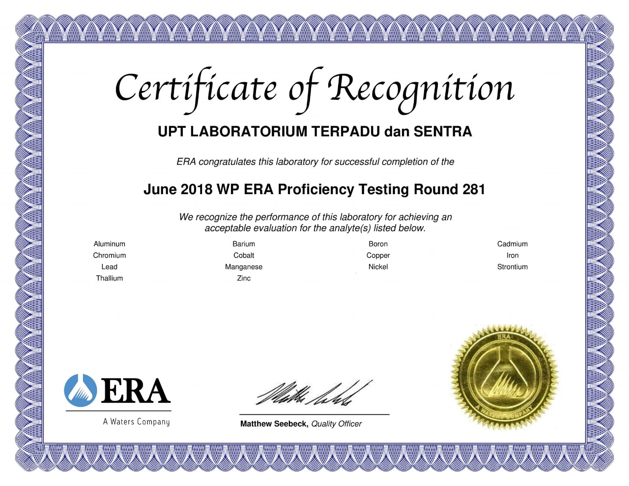 Pada awal Agustus 2018 lalu, ERA mengumumkan bahwa hasil uji profisiensi UPT LTSIT menunjukkan hasil yang memuaskan. 14 dari 16 logam yang terdaftar dinyatakan memenuhi keberterimaan dan lolos uji profisiensi. Logam-logam tersebut yaitu Al, Ba, B, Cd, Cr, Co, Cu, Fe, Pb, Mn, Ni, Sr, Tl, dan Zn.[]