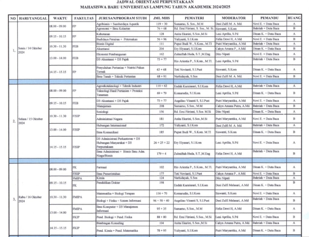 (Unila): UPT Perpustakaan Universitas Lampung (Unila) akan mengadakan kegiatan orientasi perpustakaan bagi mahasiswa baru tahun ajaran 2024 – 2025. Kegiatan orientasi akan dilaksanakan selama lima hari, mulai 14 – 18 Oktober 2024.