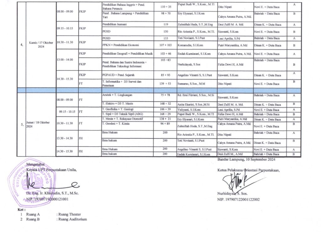 Pelaksanaan orientasi akan diadakan di gedung UPT Perpustakaan Unila, Ruang A dan B, dengan waktu yang telah ditentukan pada jadwal terlampir di bawah.