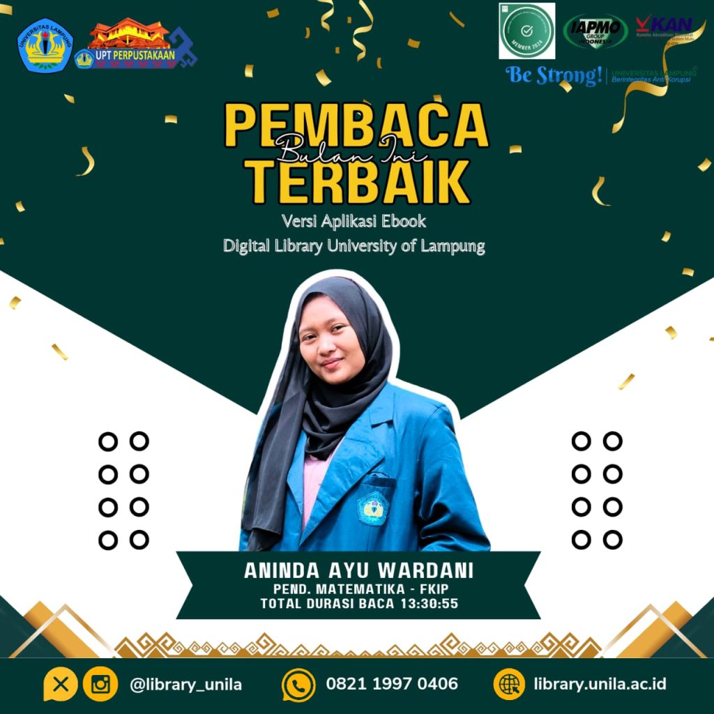 (Unila): UPT Perpustakaan Universitas Lampung (Unila) memberikan apresiasi kepada tiga mahasiswa Unila yang aktif menggunakan aplikasi ebook Digital Library Universitas Lampung. Penghargaan diberikan dalam dua kategori, yaitu Pembaca Terbaik dan Pembaca Ebook Teraktif tahun 2024.