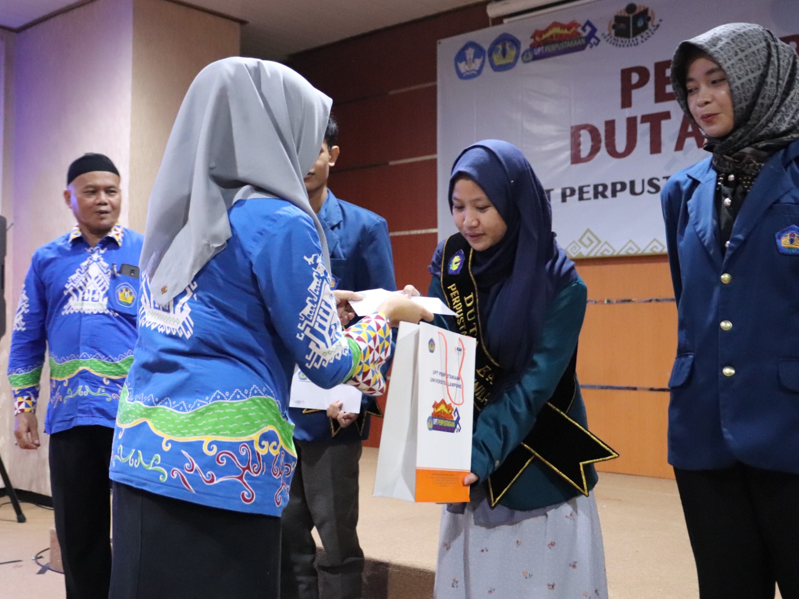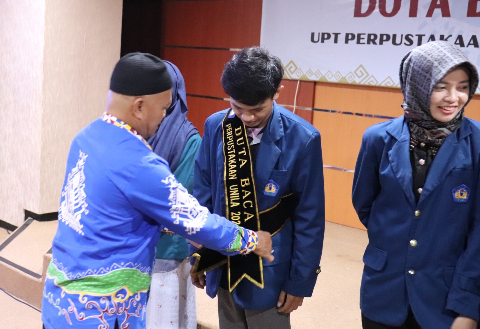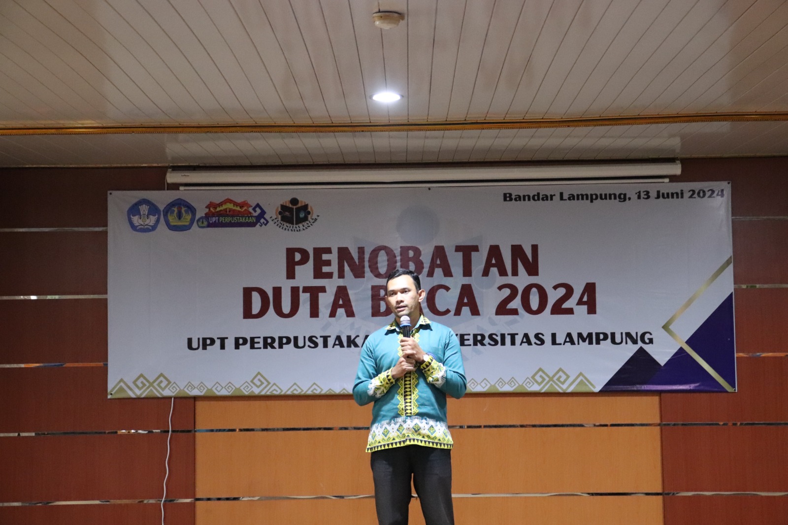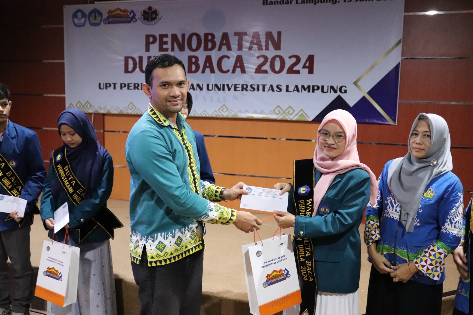 (Unila): UPT Perpustakaan Universitas Lampung (Unila) menggelar acara penobatan Duta Baca dan Wakil Duta Baca tahun 2024, Kamis, 13 Juni 2024, di Ruang Teater, lantai tiga Gedung UPT Perpustakaan.