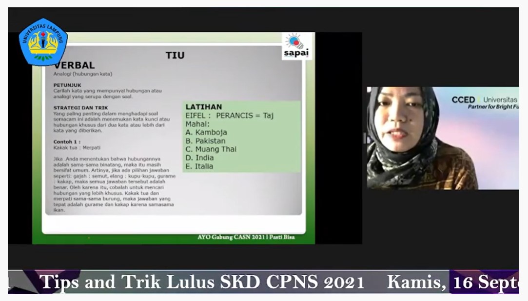 Kegiatan ini diprakarasi oleh Divisi Assesment CCED Unila yang diketuai Albert Maydiantoro, S.Pd., M.Pd. Kegiatan tersebut diharapkan dapat mempermudah langkah para peserta untuk menjadi ASN di Indonesia.