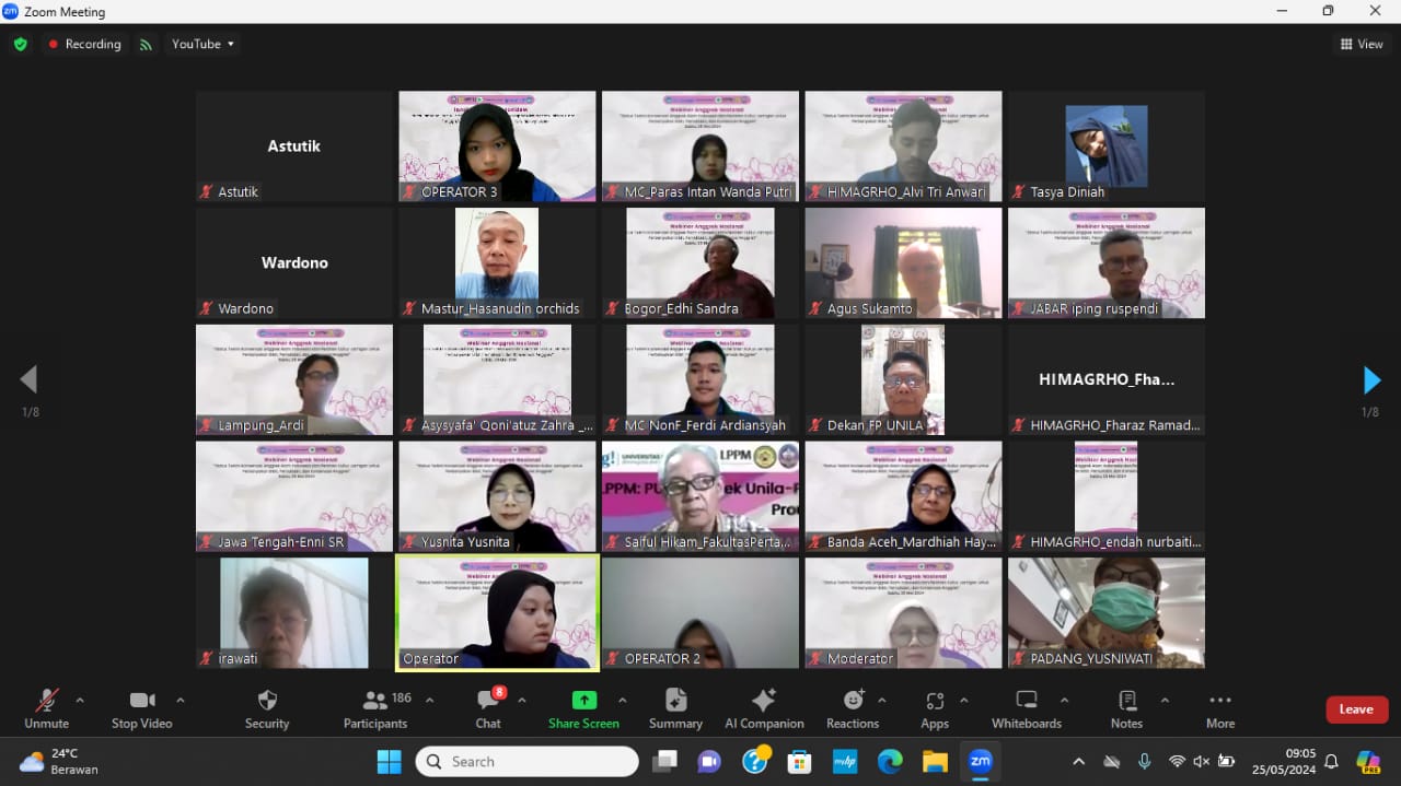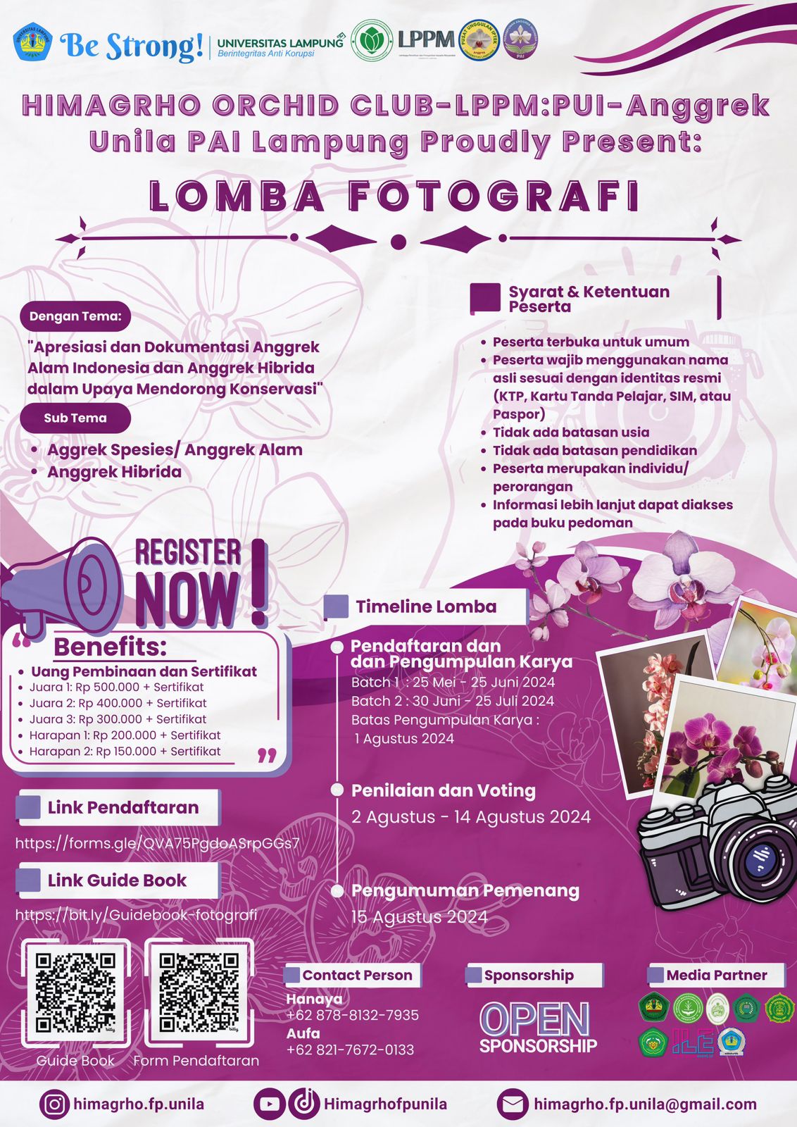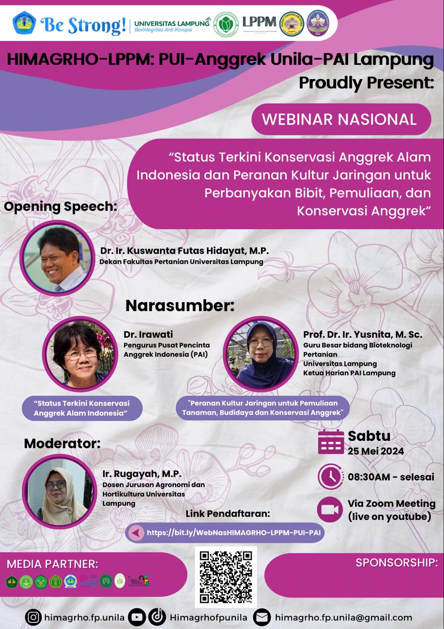 (Unila): Himpunan Mahasiswa Agronomi dan Hortikultura (Himagrho) FP Unila berkolaborasi dengan Lembaga Penelitian dan Pengabdian kepada Masyarakat (LPPM) Unila, Pusat Unggulan Iptek (PUI) Anggrek Unila, dan Pencinta Anggrek Indonesia (PAI) Lampung, adakan Webinar Anggrek Nasional pada Sabtu, 25 Mei 2024.