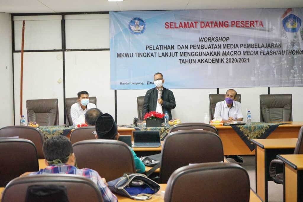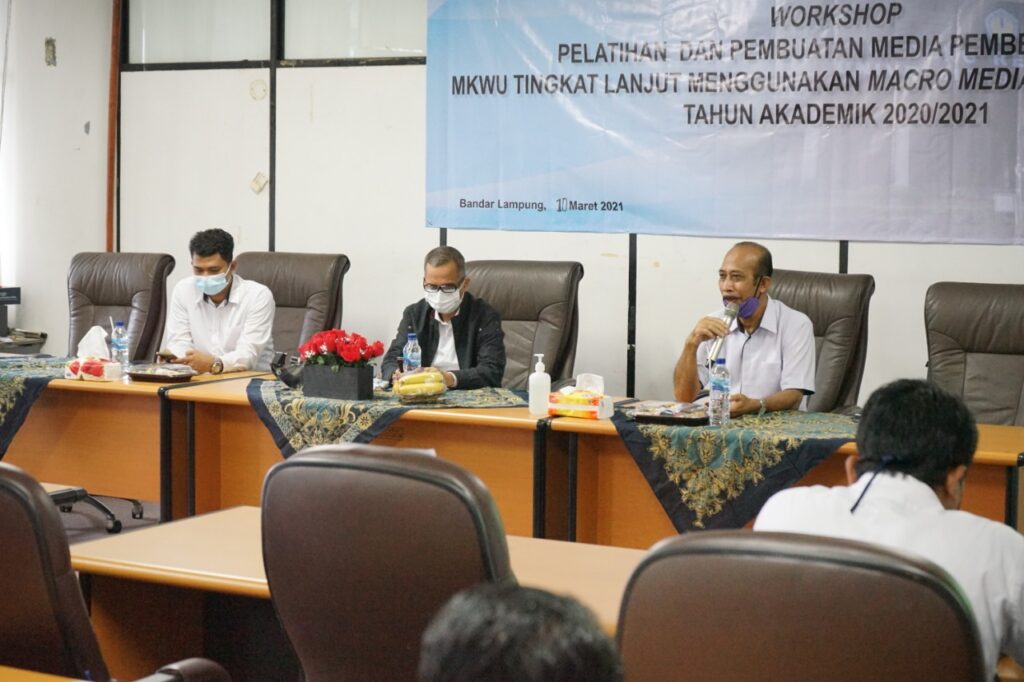 (Unila): Rektor Universitas Lampung (Unila) Prof. Dr. Karomani, M.Si., memberi sambutan pada kegiatan Workshop Pelatihan dan Pembuatan Media Pembelajaran MKU Tingkat Lanjut menggunakan Macro Media Flash/Authoware bagi Dosen Unila, Rabu 10 Maret 2021.
