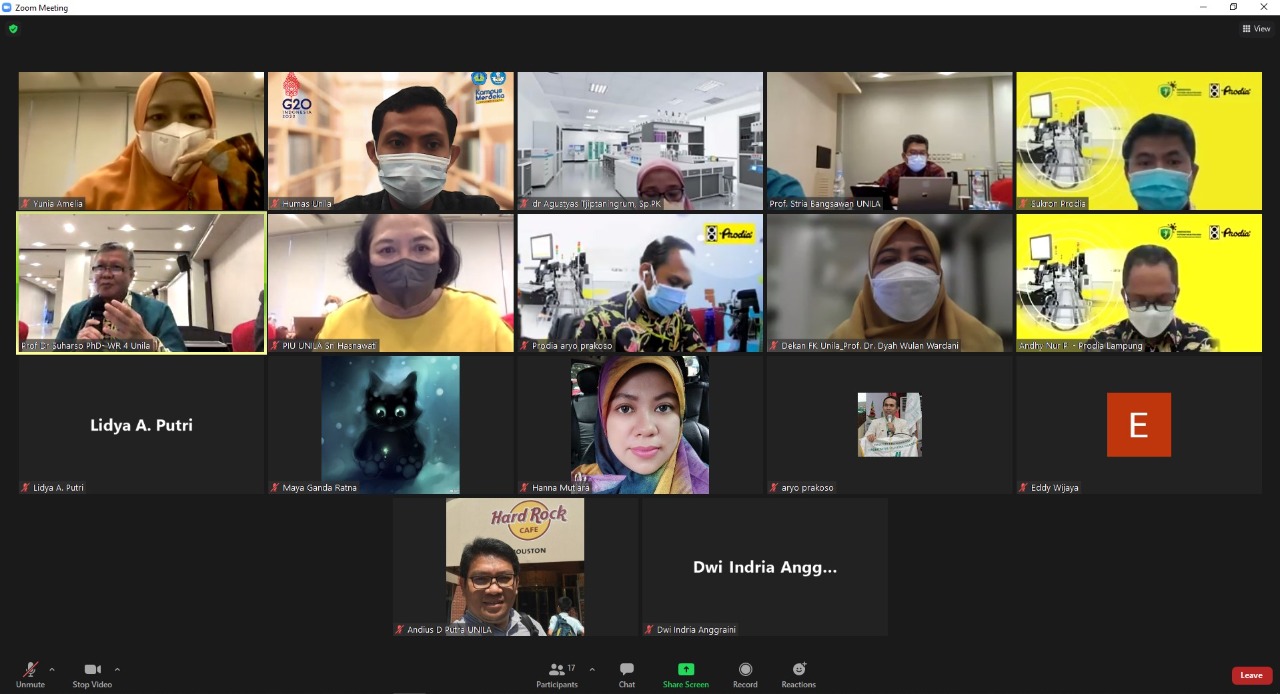 Kegiatan yang dilaksanakan di Hotel Novotel, Bandarlampung, ini dihadiri Wakil Rektor Bidang PKTIK Prof. Suharso, Manager Project PIU Prof. Satria Bangsawan, dekan FK Unila dan jajaran, serta dihadiri Senior Project Officer ADB Sutarum Wiryono secara virtual. Turut hadir secara langsung tim dari Prodia untuk menjabarkan kerja sama riset. [Humas/Riky]