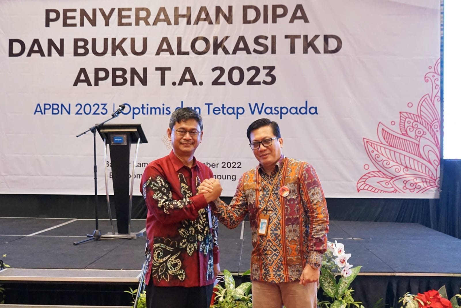 (Unila): Wakil Rektor Bidang Umum dan Keuangan (BUK) Universitas Lampung (Unila) Prof. Dr. dr. Asep Sukohar, S.Ked., M.Kes., menghadiri penyerahan Daftar Isian Pelaksanaan Anggaran (DIPA) dan buku alokasi Transfer ke Daerah (TKD) tahun anggaran 2023, di Ballroom Hotel Novotel, Selasa, 6 Desember 2022.